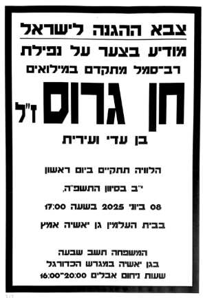 הלווייתו של חן גרוס ז"ל תתקיים היום (ראשון) בשעה 17:00 בבית העלמין בגן יאשיה-אמץ.