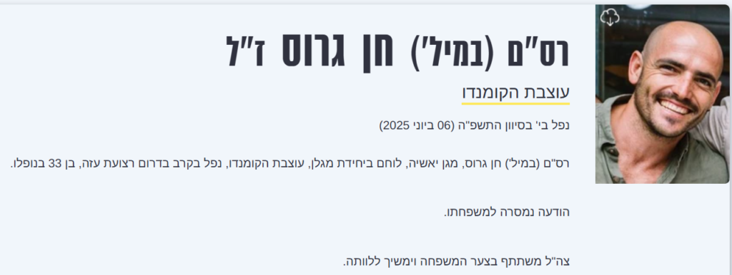 רס"מ (מיל') חן גרוס הי"ד, לוחם ביחידת מגלן וחבר כיתת הכוננות ביישוב חיננית שבשומרון, נפל בקרב בשכונת בני סוהילה בדרום רצועת עזה. גרוס, בן 33, היה דמות מרכזית בקהילתו – לוחם אמיץ, חבר אהוב ופעיל חברתי נמרץ.